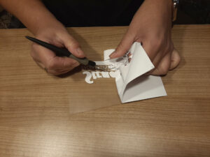 Als nächstes wird die überschüssige Folie entfernt, diesen Vorgang nennt man freistellen oder entgittern, dies geht nur in Handarbeit.
